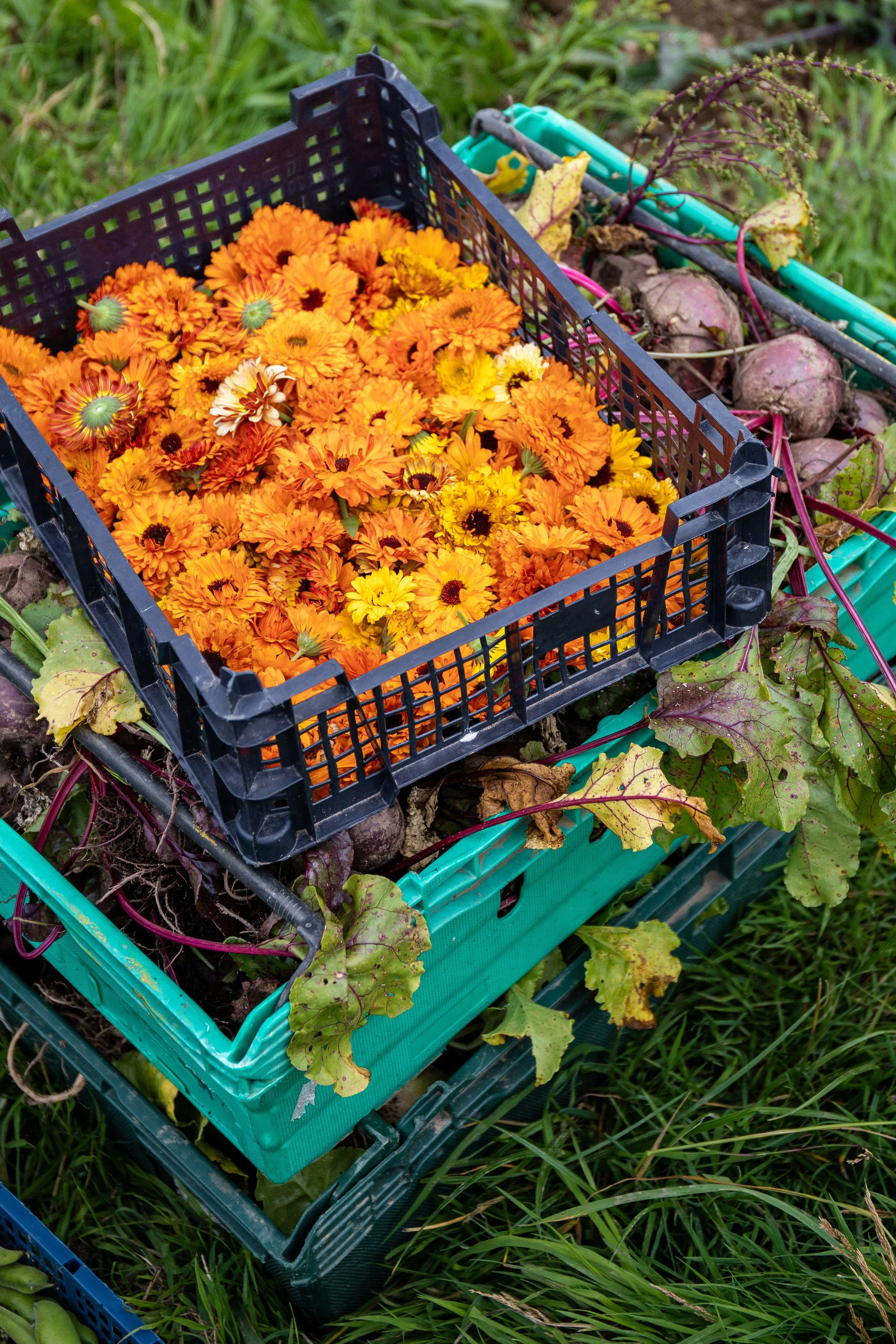 Our produce is sold locally via our seasonal veg box subscription and local farm shops, our surplus used for our on-farm dinners.